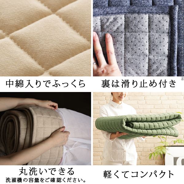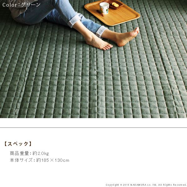 【カラーバリエーション】 ベージュ・グレー・グリーン・ブルー 【仕様】 本体:ポリエステル80%、綿20% 裏面:不織布(滑り止め加工) 中綿:ポリエステル100% 【サイズ】 約185x130cm 重量:約2kg 株式会社ナカムラ(33100019)お届け営業日16時までにご注文・入金確認で3〜6営業日以内に出荷※土、日、祝日は出荷業務をお休みしております。